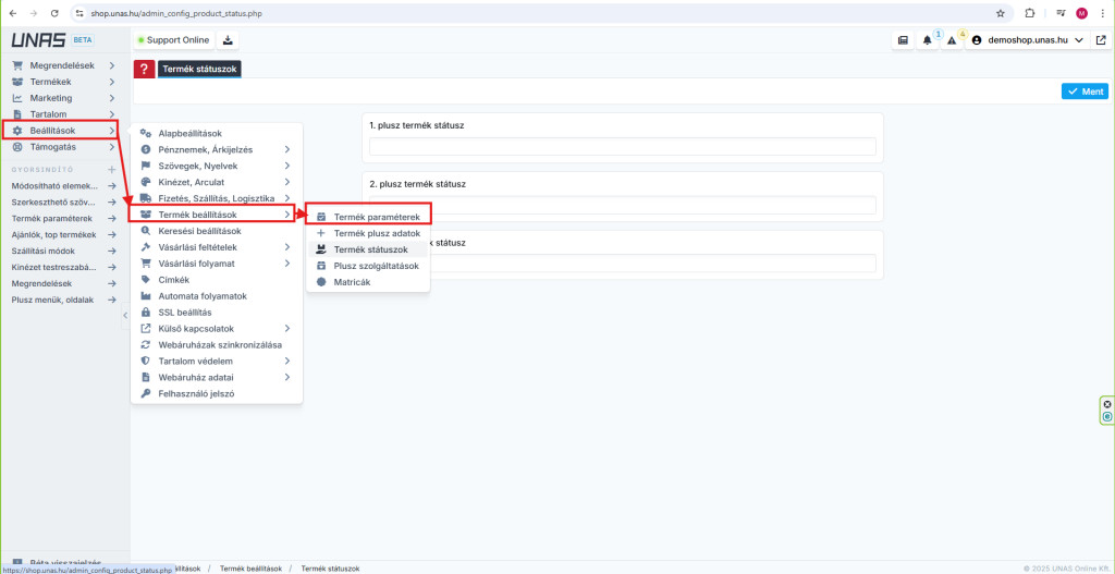 – Termék státuszok (használható a termék adatlapján kiemelt információ megjelenítésére, valamint a megrendeléseknél a tételekhez lehet információkat hozzáadni, illetve a matricák szerkesztésénél is szűrni lehet a termék státuszokra)